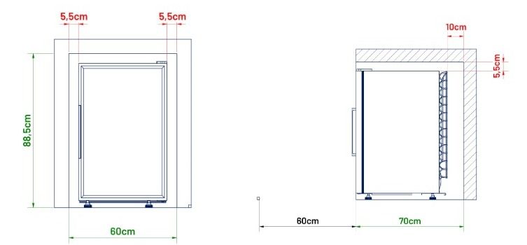 Em vermelho: Espaço mínimo entre o móvel e o produto.