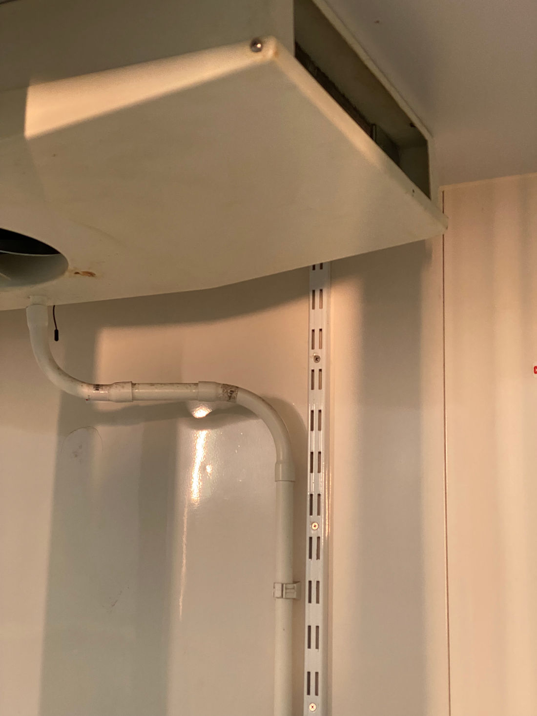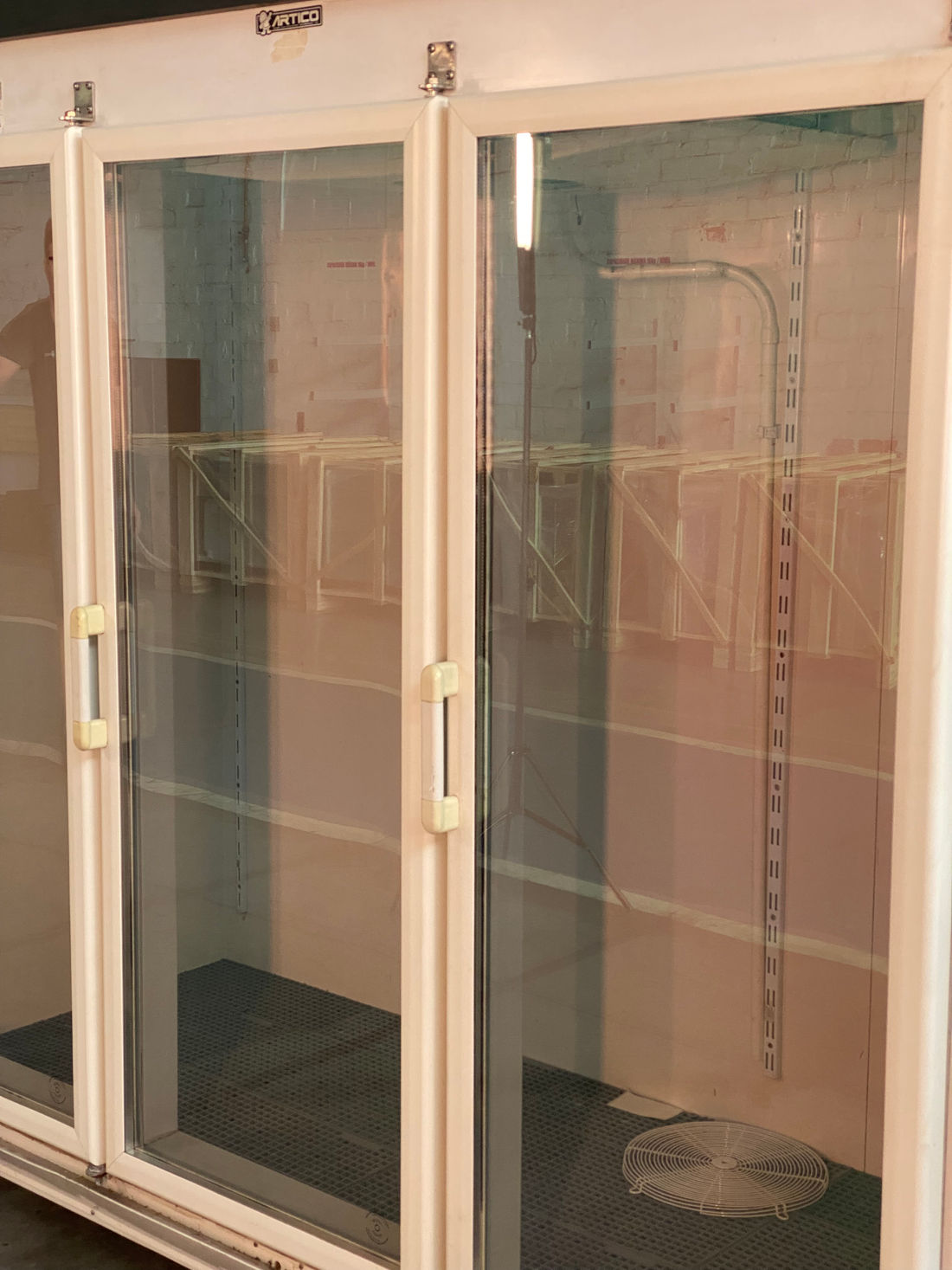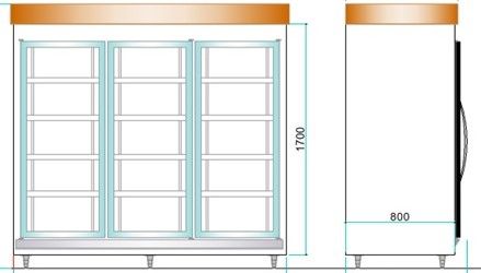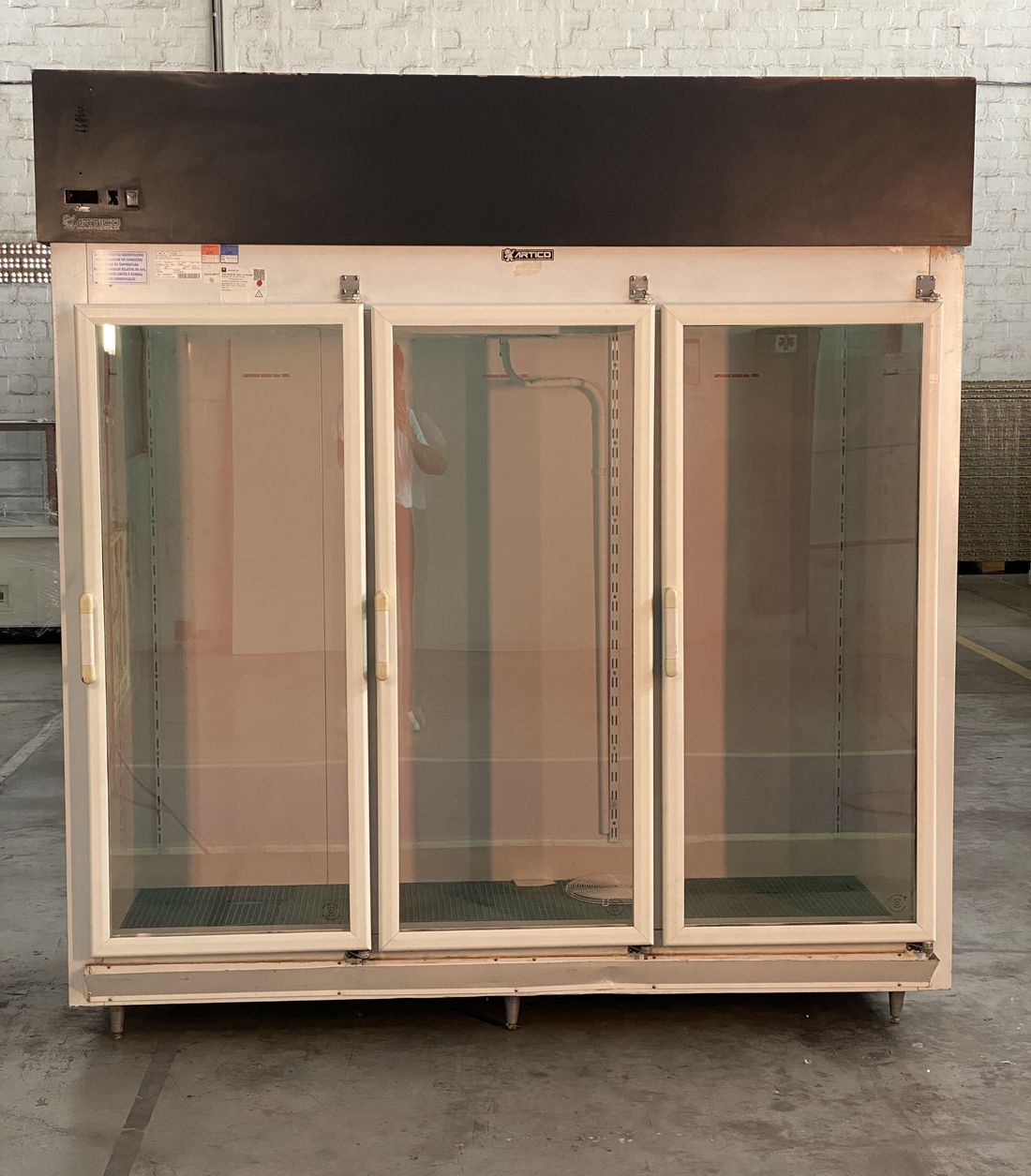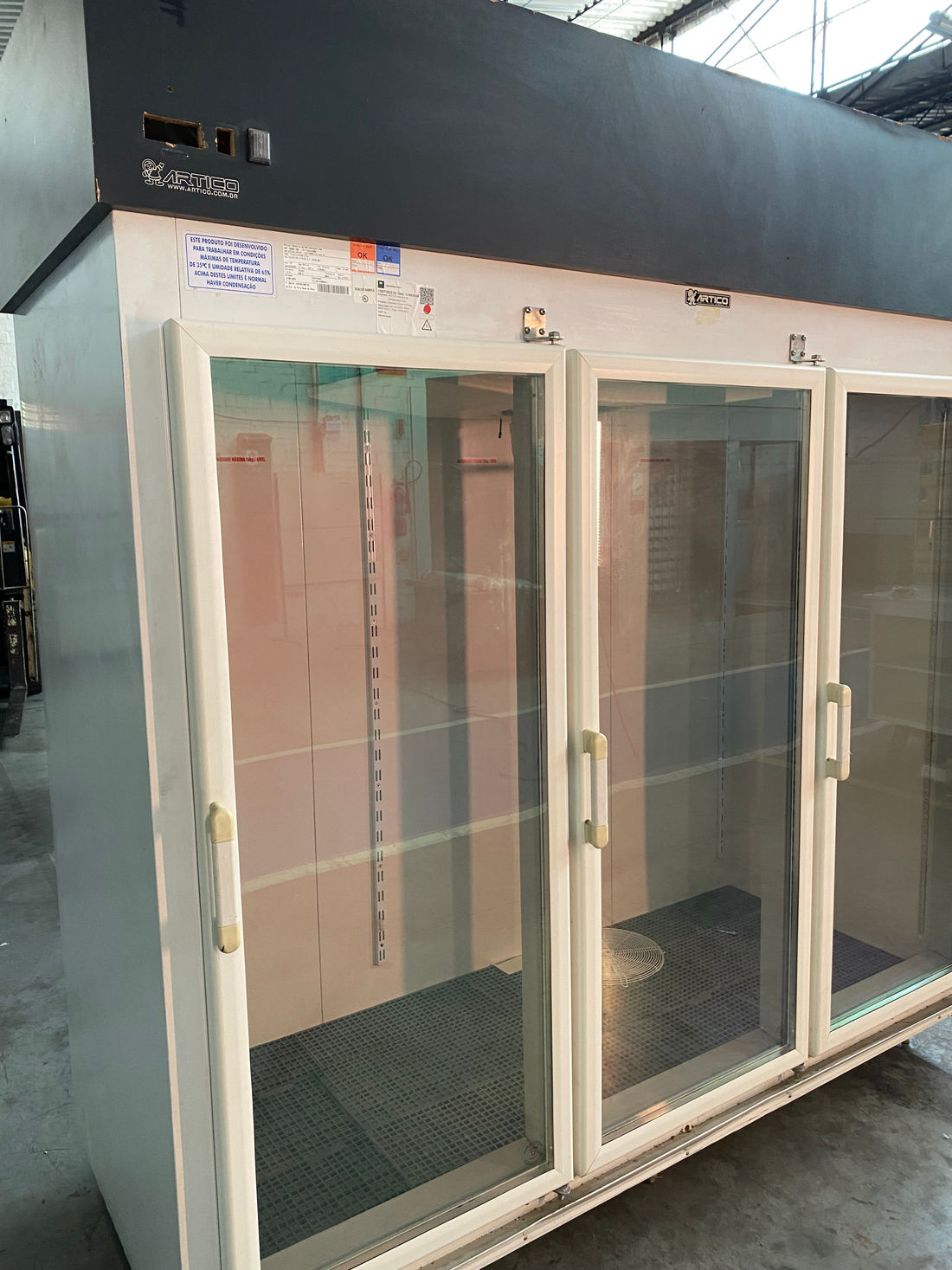 Especial para exposição e conservação de bebidas, frios e laticínios, medindo 2,00 m de comprimento, 2,15m de altura, 0,80m de profundidade, isolada com poliuretano injetado de alta densidade (Ecológico), revestida totalmente em chapa de aço kromma, possui três portas de vidro duplo ante embaçante e acabamento branco, com 4 níveis de prateleiras de grades com pintura eletrostática, base interna da geladeira com gradeado plástico, luz frontal embutida, painel com termômetro e termostato para controle da temperatura e maquinário remoto e sistema de resfriamento à base de ar forçado. (Equipado com compressor e componentes para uso de gás ecológico conforme normas da ISO e ABNT). (Temperatura de funcionamento de +2ºC a +8ºC). Possui capacidade interna de 1.900 litros.