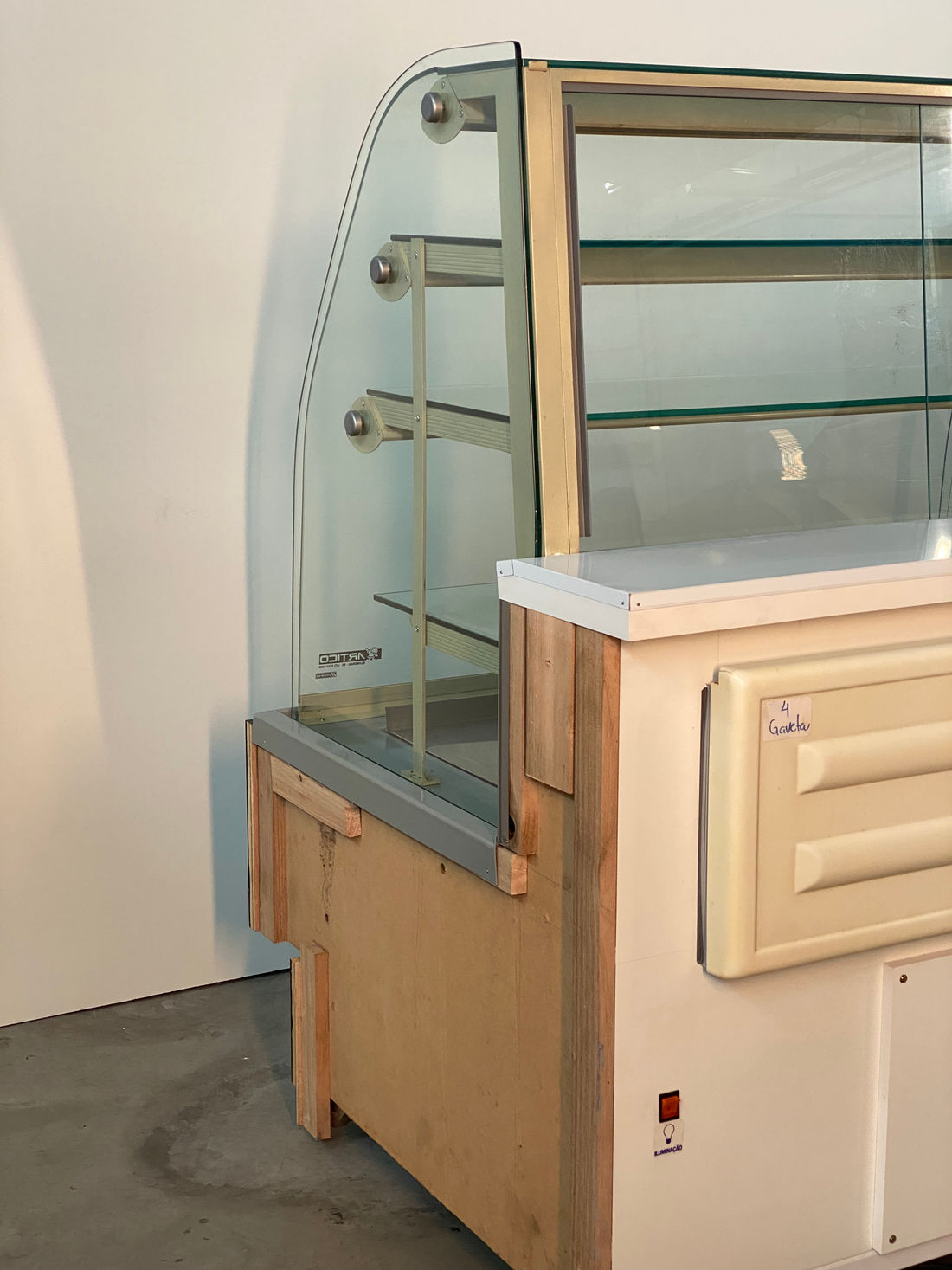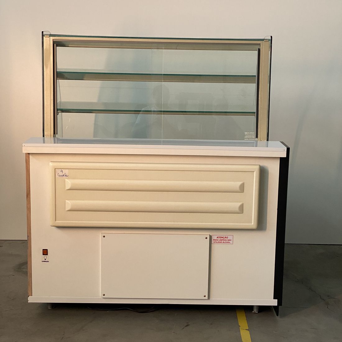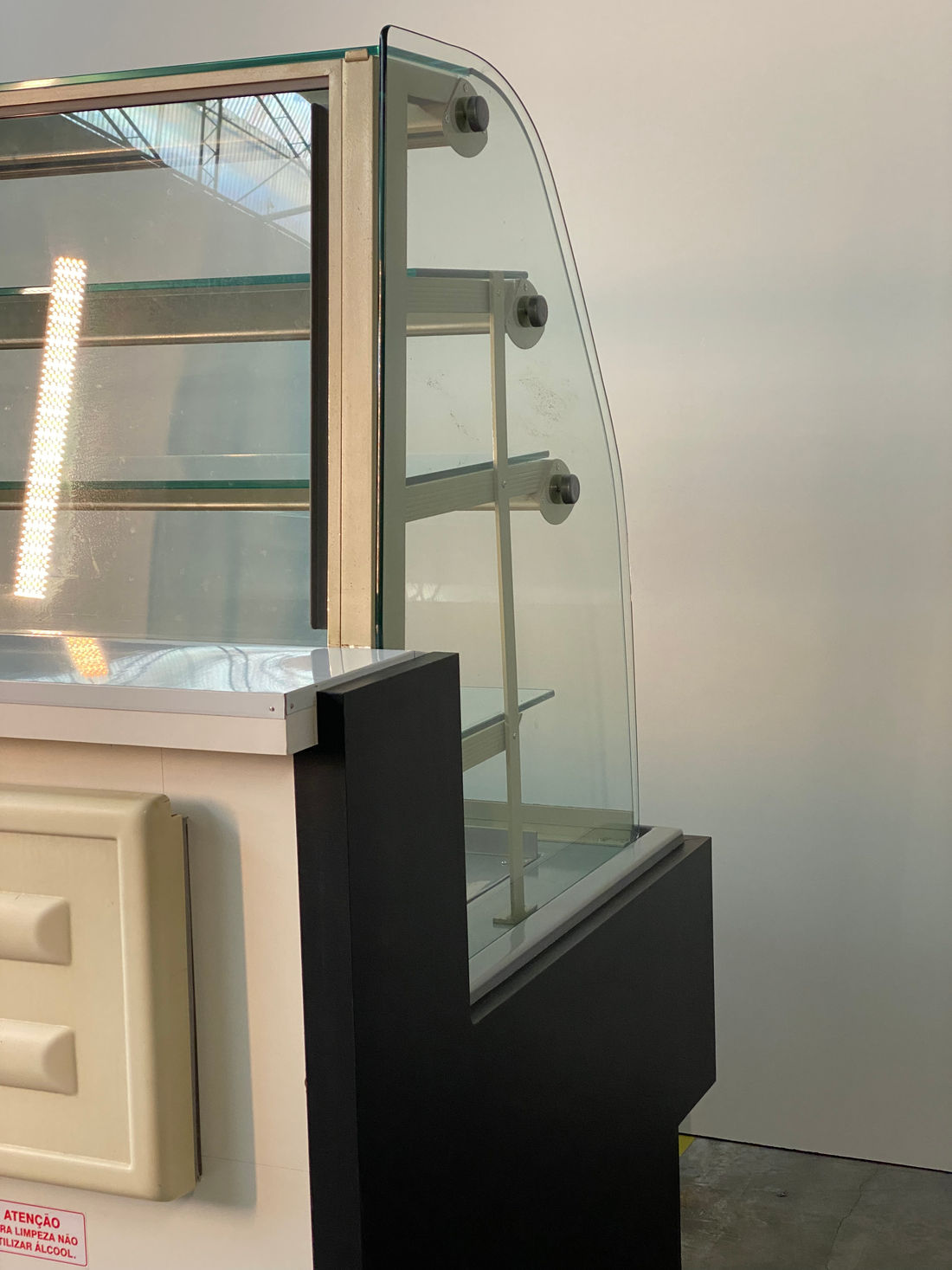 Composta por base e três prateleiras (NEUTRA) - especial para exposição e conservação de PRODUTOS NEUTROS, medindo 1,27 x 0,97 x 1,38m de altura, possui estrutura de chapa kromma pre pintada, revestimento frontal em laminado decorativo liso, vidro frontal curvo móvel e removível, três níveis de prateleiras com perfis de alumínio prateado, GAVETA DESLIZANTE PARA ABASTECIMENTO E EXPOSIÇÃO, COM VISIBILIDADE DE 100% DOS PRODUTOS, três calhas de luz de LED com proteção de acrílico 3mm e área para fixação de preços, vidros laterais lapidados e polidos com 8 mm.